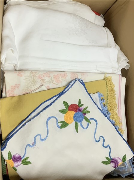 Cartone contenente numerose tovaglie di fogge e dimensioni differenti (difetti)