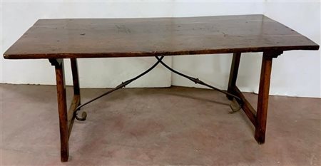 Antico tavolo ''fratino'' in legno con raccordi in ferro battuto (cm 186x80x79) (difetti e restauri)