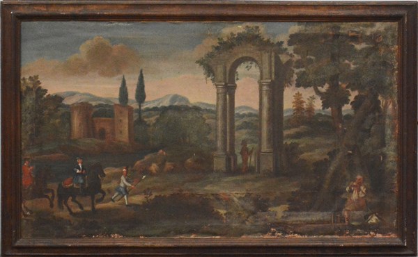 Ignoto "Paesaggio con rovine e figure" antico dipinto ad olio su tela (cm 90x150). In cornice