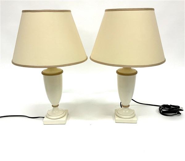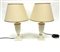 Coppia di lampade da tavolo. Meda, produzione recente. Fusto in legno tornito e verniciato bianco e beige, paralume in stoffa. (h cm 49)