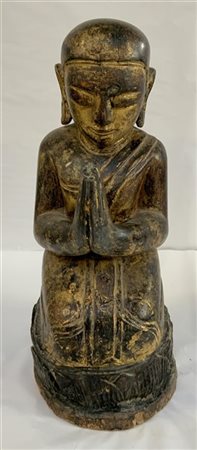 Manifattura sud-est asiatico, figura assisa in preghiera in legno parzialmente