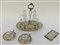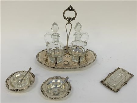 Lotto composto da un cruet-stand in argento, un porta stuzzicadenti e due saliere con cucchiaini, contenitori in cristallo (gr 780) (difetti e mancanze)