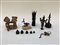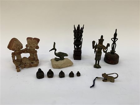 Manifatture orientali diverse. Lotto composto da un campanello, quattro sculture, un lucchetto ed un set di cinque pesi per oppio