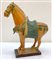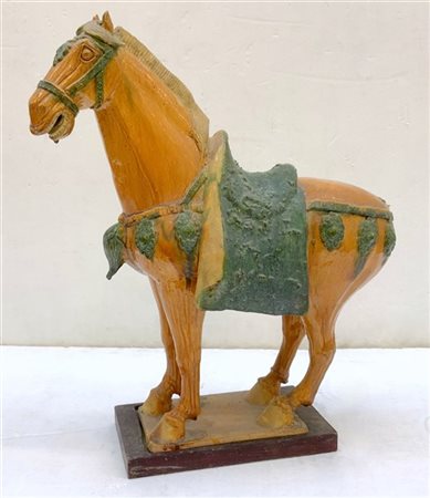 Manifattura di Hong Kong, cavallo in stile Tang con base in legno e marchio alla base (difetti e mancanze)