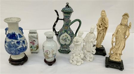 Lotto composto da due coppie di sculture, tre vasi e un versatoio (gravi difett