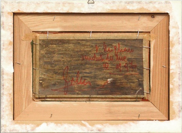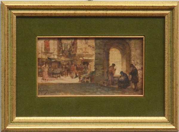 "Mercato" olio su tavola (cm 15x25) Firmato in basso a sinistra. Al retro: timbro della Galleria Leonardiana, Alassio. In cornice (Difetti)