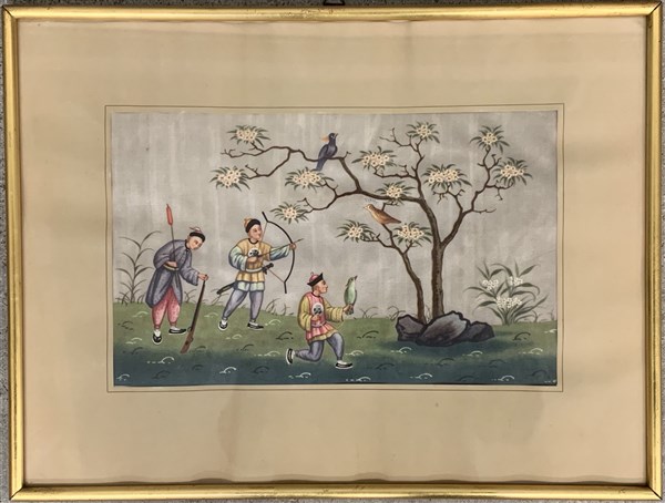 Stampa su seta raffigurante cacciatori, in cornice. Cina, secolo XX (20x31 cm.)