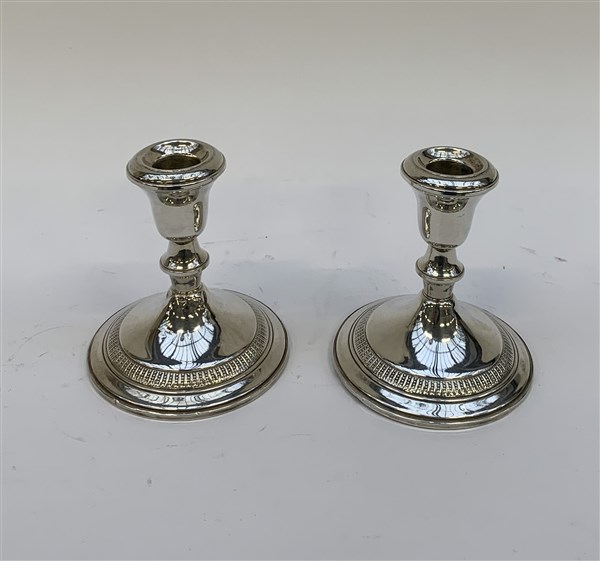 Coppia di candelieri in argento sterling con basi decorate a perlinature (h cm 12,5) (g lordi 700)