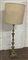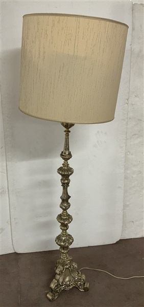 Torciera con corpo interamente rivestito in metallo argentato, sbalzato a volute e motivi vegetali. Montata a luce elettrica con paralume (h cm 180) (difetti)