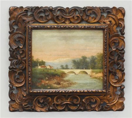 Ignoto della prima metà del XX Secolo "Paesaggio con ponte" olio su tela (cm 38