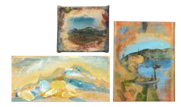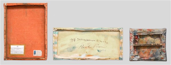 Lotto composto da tre dipinti a tecnica mista su tela, misure diverse, iscritti al verso (difetti).