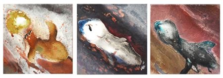 Lotto composto da tre dipinti a tecnica mista su tela di soggetti diversi, cm 38x38