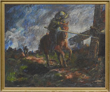 Reiner "Don Quijote" 1971 olio su masonite (cm 100x120) firmato e datato in basso a destra, firmato e titolato al retro, in cornice