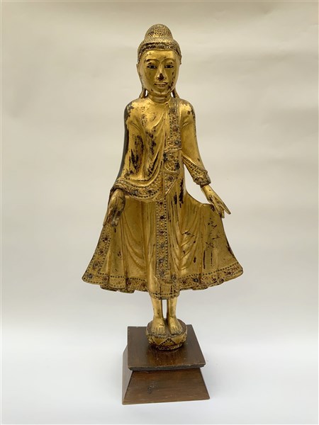 Arte sud-est asiatico, figura di Buddha stante in legno parzialmente dorato, ba