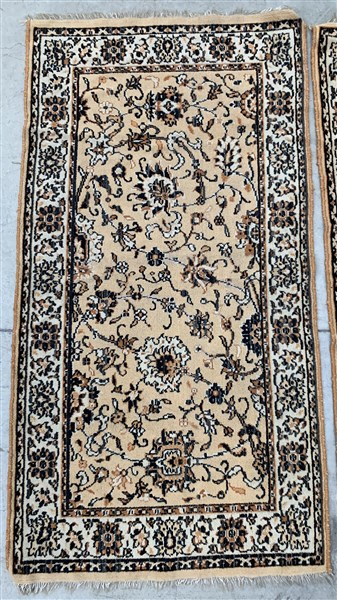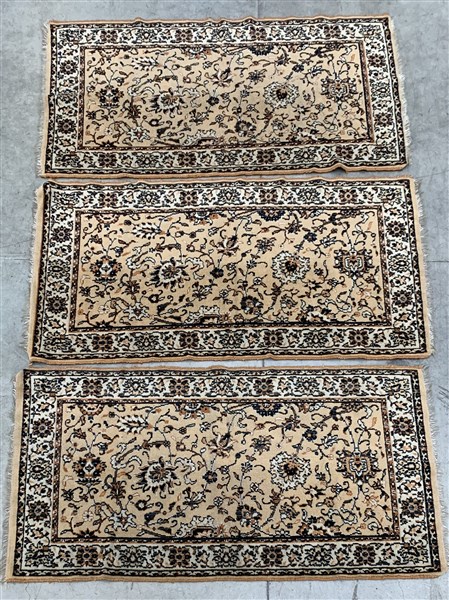 Lotto di tre tappeti meccanici decorati con motivi floreali su fondo beige (cm 155x83)(Lievi difetti)