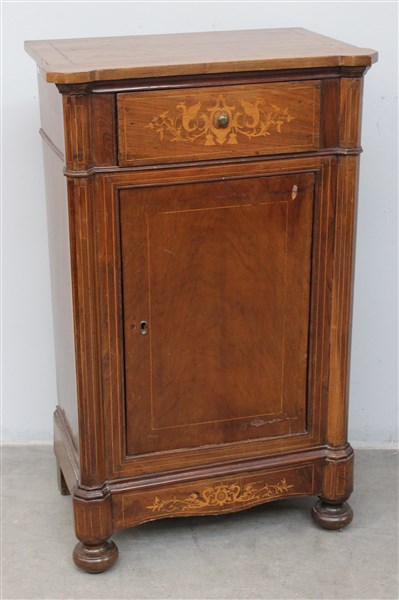 Lotto 1404 | Comodino ad un'anta ed un cassetto intarsiato, secolo XIX (cm 58x95x37) (difett