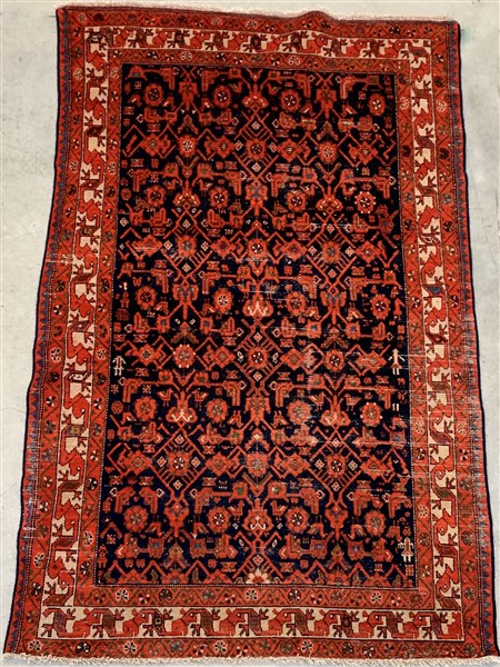 Tappeto Ferahkan, Persia, Secolo XX. Decoro Herati in rosso su fondo blu notte. (difetti e rapature) (cm 204x127)