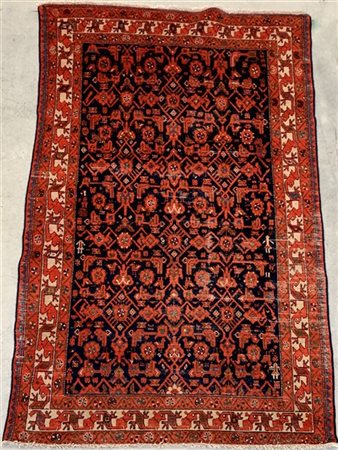 Tappeto Ferahkan, Persia, Secolo XX. Decoro Herati in rosso su fondo blu notte.