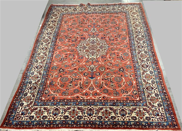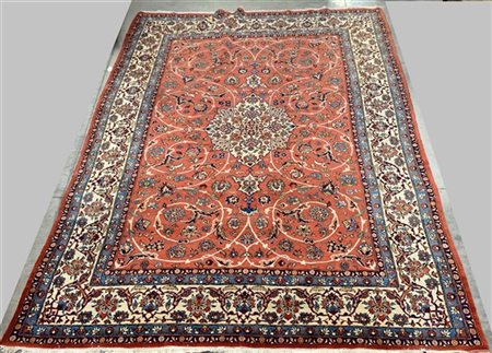 Tappeto Tabriz, Persia, secolo XX. Decoro con medaglione bianco, con puntali su campo color corallo cosparso di volute bianche fiorite. (cm 405x245) (Difetti)