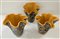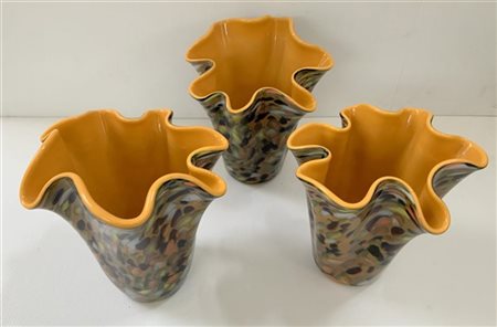 Lotto di tre vasi a fazzoletto in vetro policromo con interno giallo (h cm 21)