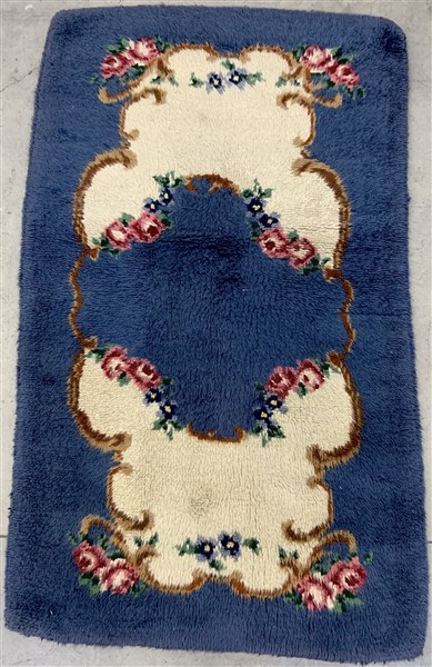 Tappeto tipo Savonnerie, Europa, inizio Secolo XX. Decoro floreale policromo fondo bianco e azzurro. (cm 185x110) (Lievi difetti)