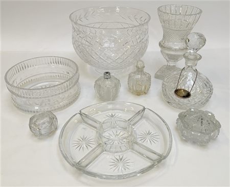 Lotto composto da un vaso, due centrotavola, una bottiglia per liquore, due porta profumi, una antipastiera a più contenitori e due scatoline, tutti in cristallo molato (difetti)