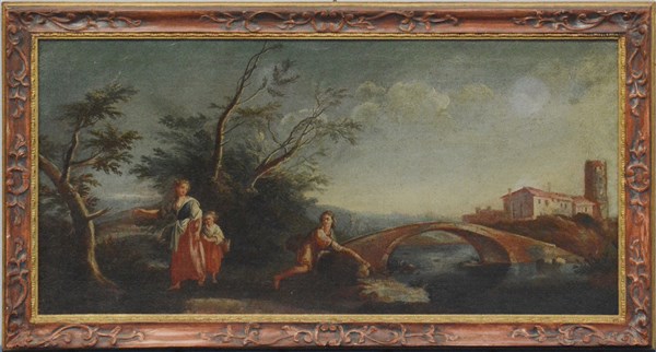 Scuola del secolo XVIII "Paesaggio fluviale con figure" olio su tela (35x72). I