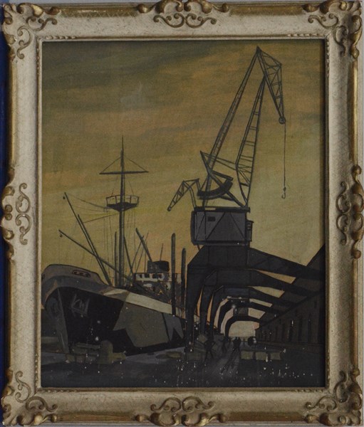 "Cantiere portuale" tecnica mista su cartoncino montato su telaio (cm 63x50) Al retro: firmato e datato 1953. In cornice