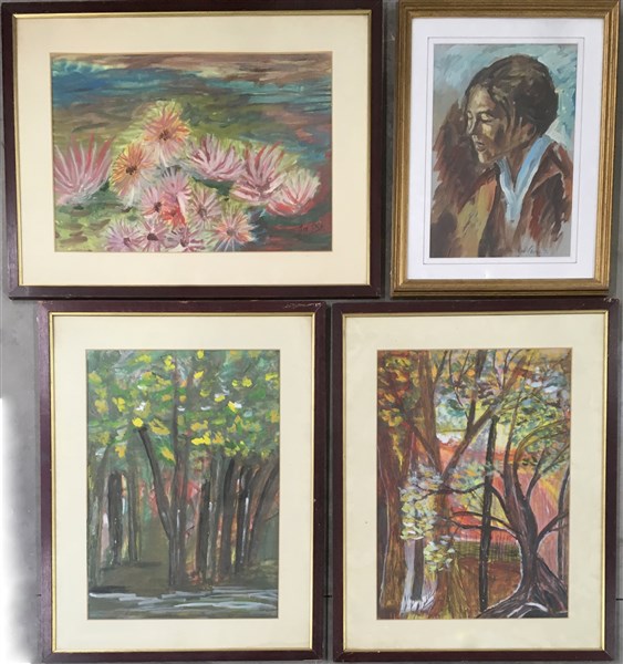 Lotto composto da tre dipinti ad olio su cartoncino firmati Gio Cei, raffiguranti fiori ed alberi (cm 66x46), e un ritratto femminile ad olio su tela firmato Nino Chiesa (cm 50x34), in cornici