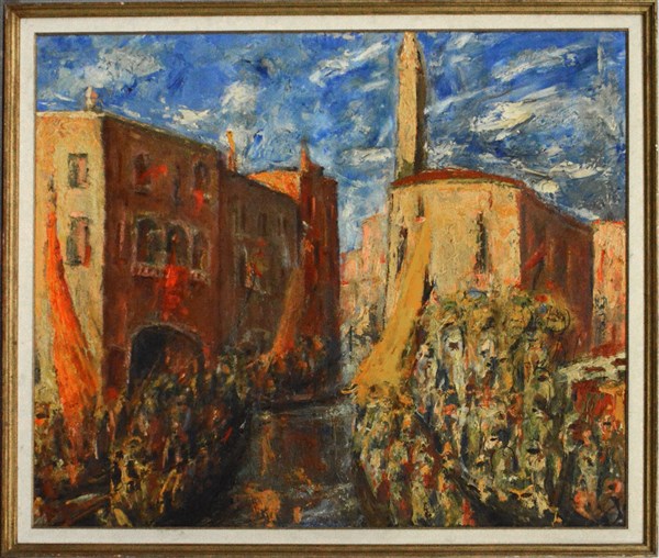 Cav. Franco Marinotti in arte Francesco Torri "La Patria in pieno Carnevale" 1964olio su telacm 101x121firmato in ba