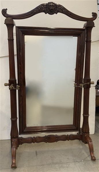 Psiche da terra lastronata con specchio basculante, montanti a colonne scanalate sormontate da cimasa intagliata a volute centrate da testa leonina. Secolo XIX (cm 230x145x67 circa)