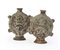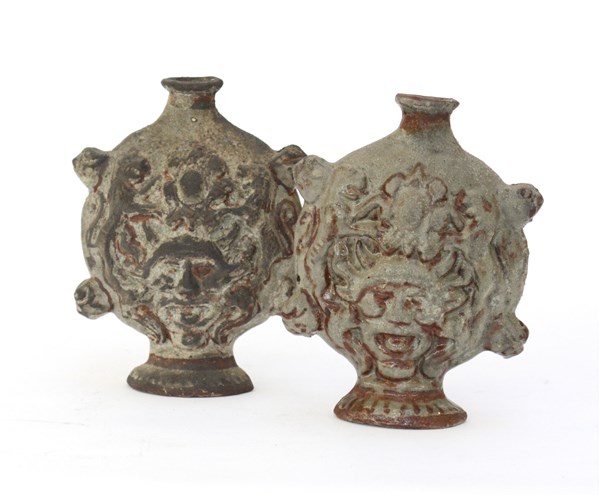 Coppia di fiasche da pellegrino in terracotta smaltata e decorate a rilievo a volti e animali (h. cm 20) (difetti)