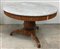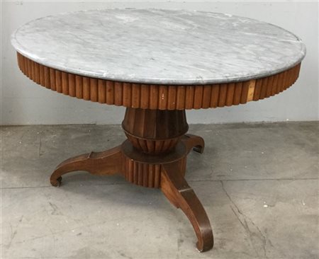 Tavolo rotondo in noce, fascia dentellata, gamba centrale a colonna sagomata a parallelepipedo su tre piedi mossi. Ripiano in marmo. Secolo XIX (cm 123x78) (difetti, mancanze e restauri)
