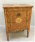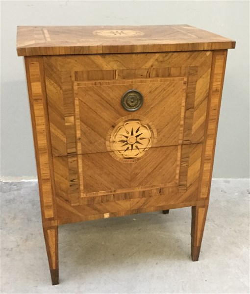 Antica comoda lastronata e intarsiata in noce a un cassetto sul fronte. Piedi a obelisco rovesciato (cm 55x74,5x35,5) (difetti)