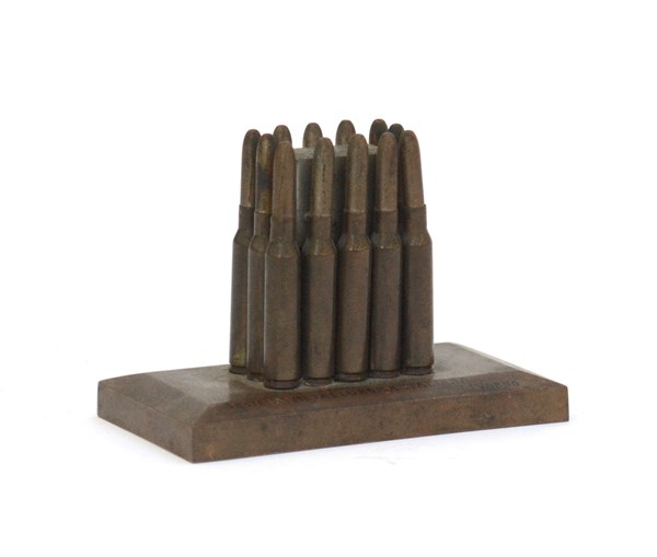 Fermacarte in bronzo decorato a finti proiettili. Oggetto pubblicitario con inscrizione "Società metallurgica italiana Livorno-Fabbrica di munizioni Bardalone Pistoiese" (cm 13x10x7)