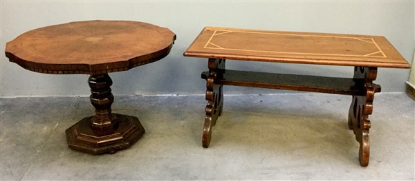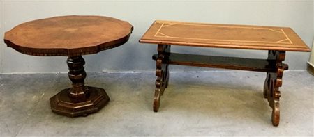 Lotto composto da due tavolini da salotto in legno di epoche diverse, con ripiani filettati, uno di forma sagomata e l'altro rettangolare (difetti)