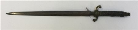 Daghetta da caccia con impugnatura in cuoio intrecciato, guardia ad "S" in bronzo e lama a losanga a doppio taglio. Produzione europea, prima metà del secolo XIX (l. cm 44) (senza fodero)