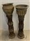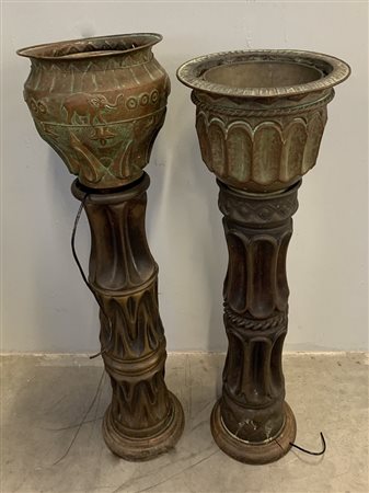 Arte di trincea. Lotto composto da due curiose colonne costituite da diversi pezzi di bossoli di artiglieria sbalzati e cesellati a formare due lampade da terra in metallo. Primo quarto del secolo XX (h. cm 104; h. cm 99) (lievi difetti)