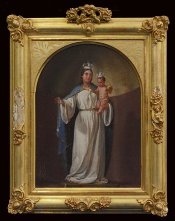 Ignoto secolo XIX "Madonna con bambino" olio su tela (cm 43x30) In cornice coeva in legno e pastiglia dorata (difetti e mancanze)