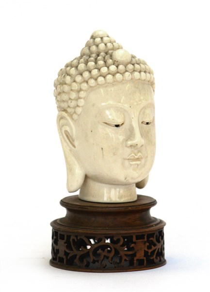 Manifattura orientale "Testa di Buddha" scultura in avorio, poggiante su base lignea traforata