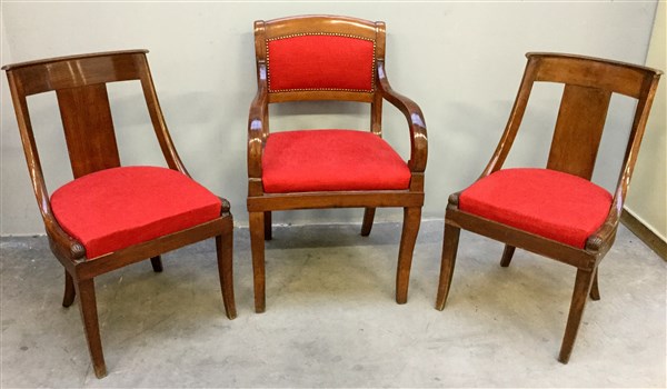 Lotto 1626 | Lotto composto da una poltrona e due sedie in legno con gambe a sciabola (difet