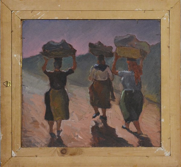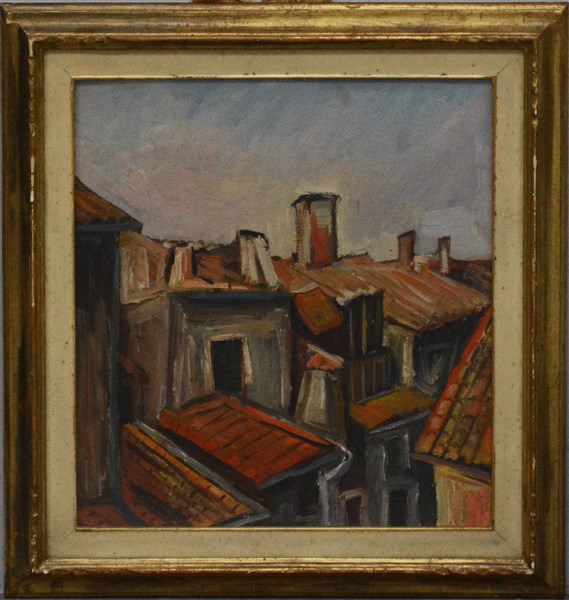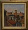 Firma indecifrata "Tetti" olio su compensato. Firmato in basso a destra. Al retro figure in un paesaggio (cm 50x45). In cornice (lievi difetti)