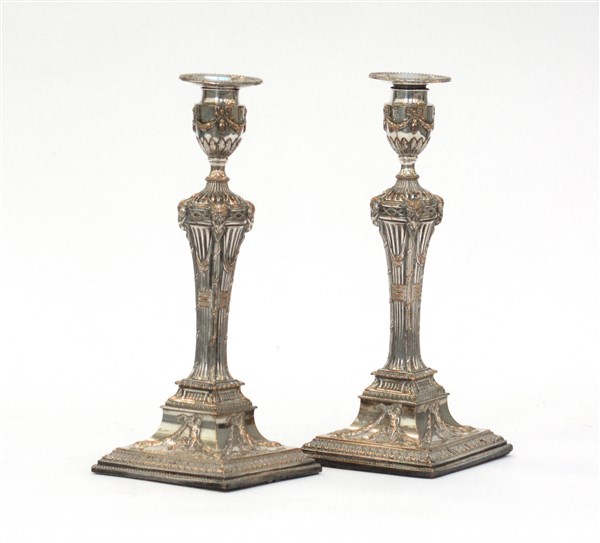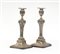 Coppia di candelieri in metallo argentato con fusto a colonna scanalata decorat