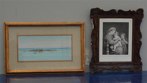 Lotto composto da un dipinto ad olio su compensato con veduta marina ed un'incisione del secolo XIX raffigurante la Madonna della seggiola. In cornici (misure differenti) (difetti)
