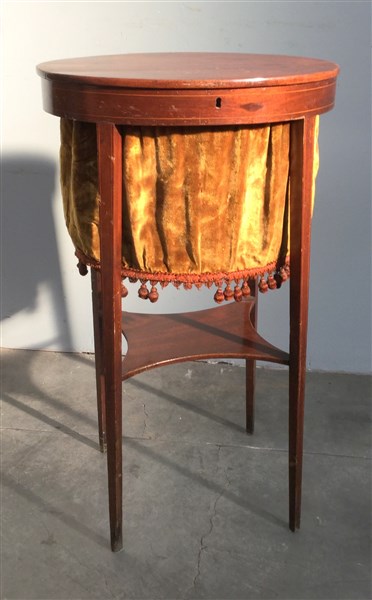 Tavolino portacucito di forma ovale con fasce e gambe filettate in legno chiaro e unite da mensolina. Inghilterra, secolo XIX (cm 45x78x34) (difetti)