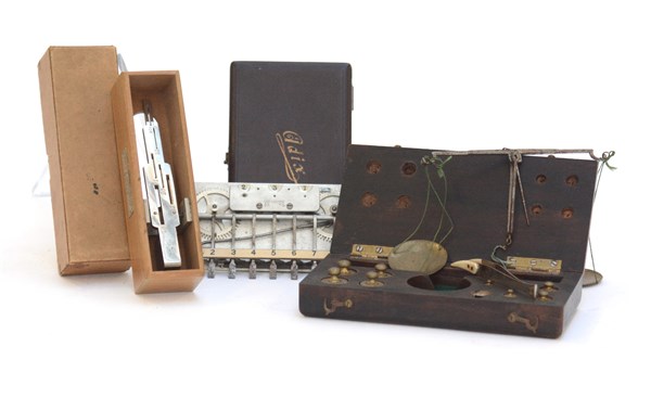 Lotto composto da un pesamonete, un bilancino in custodia e un addizionatore meccanico in custodia (lievi difetti)