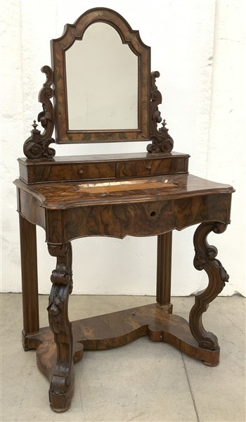 Mobile da toilette lastronato in noce con specchio basculante entro montanti intagliati. Fascia a un cassetto con gambe anteriori mosse poggianti su pianetto. Secolo XIX (cm 80x150x50) (difetti)