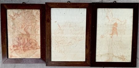 Lotto composto da tre disegni a sanguigna di epoche e soggetti diversi (circa cm 36x25; cm 39x26; cm 39x27)