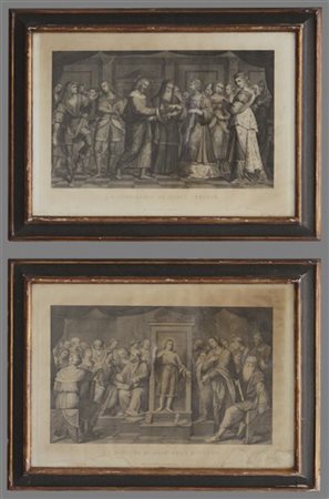 Coppia di acqueforti del secolo XIX raffiguranti la Disputa di Gesù tra i dottori e lo Sposalizio della Vergine (cm 50x70) Edizione Giovanni Cogliati Milano (difetti)