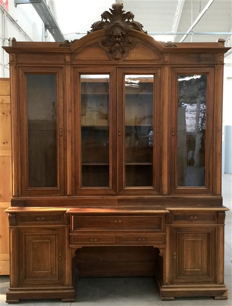 Mobile a due corpi di struttura architettonica con parte superiore a quattro ante a vetri decorate al centro da cimasa intagliata a mascherone e volute. Parte inferiore a cinque cassetti di diverse misure e ante nei montanti. Secolo XIX (cm 230x300x70) (difetti)
